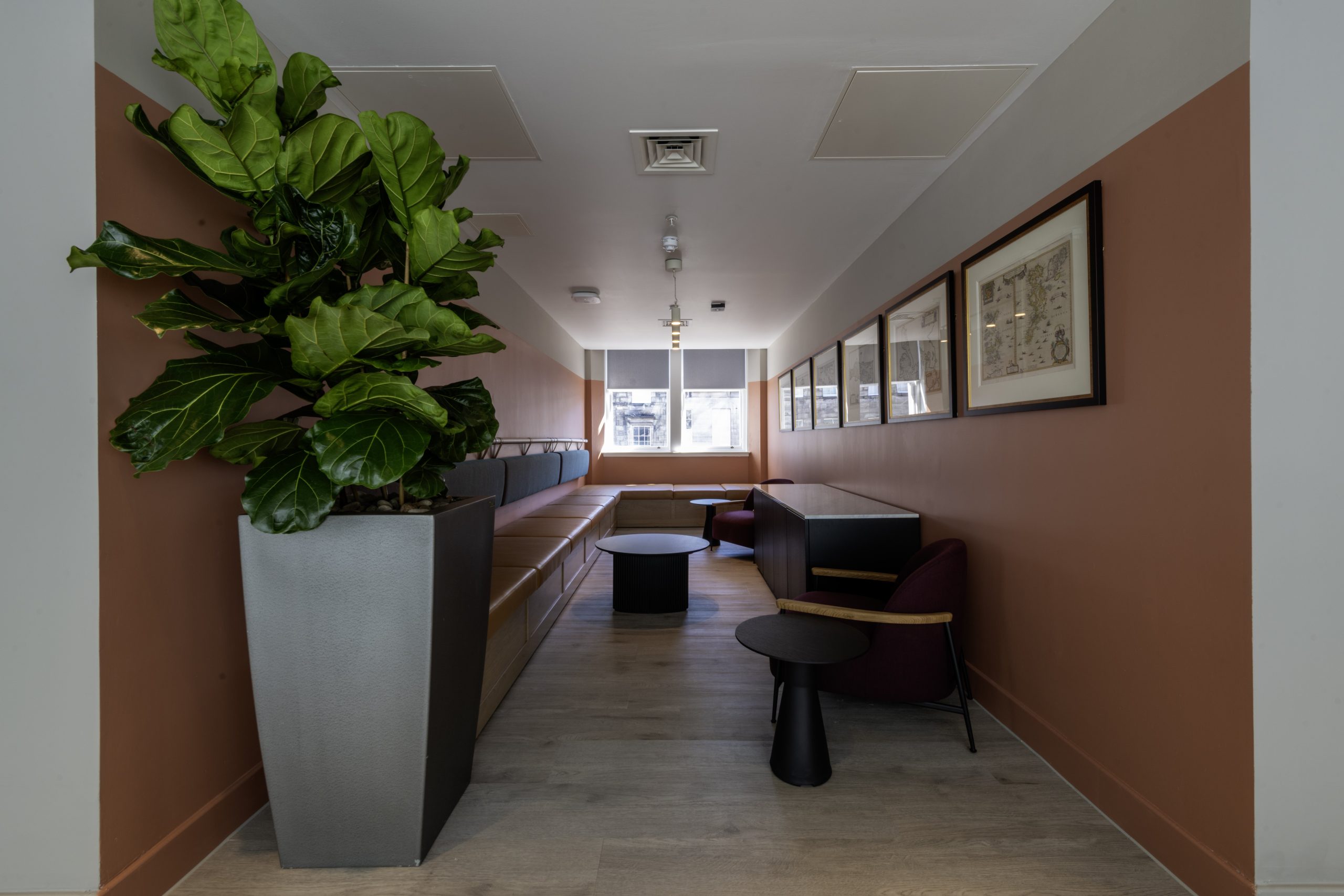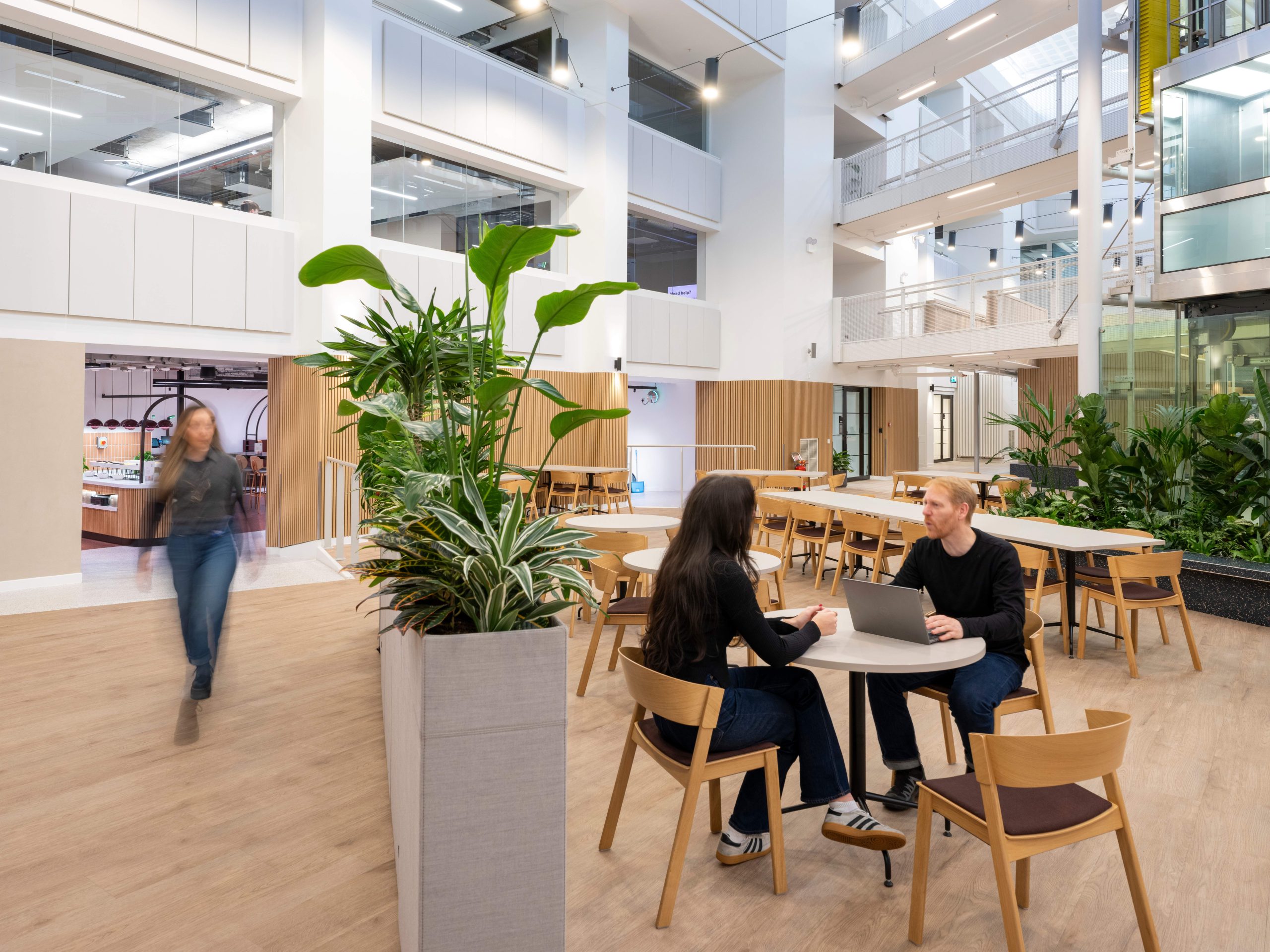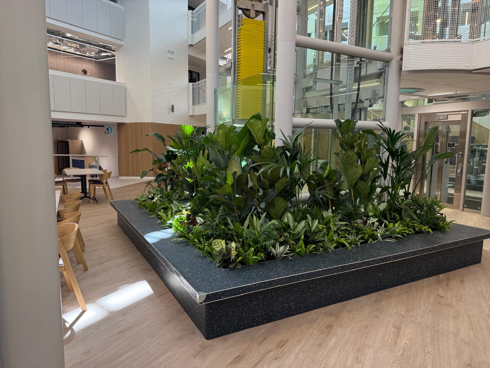 In the atrium and café areas, larger bespoke planters are used to break up open seating and subtly define zones.