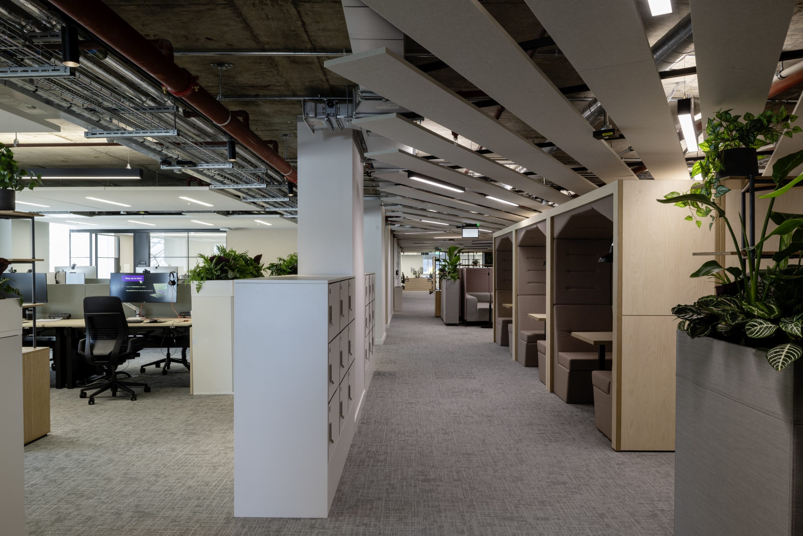 Across the main office floor, planting is integrated into desks, storage and booth seating.
