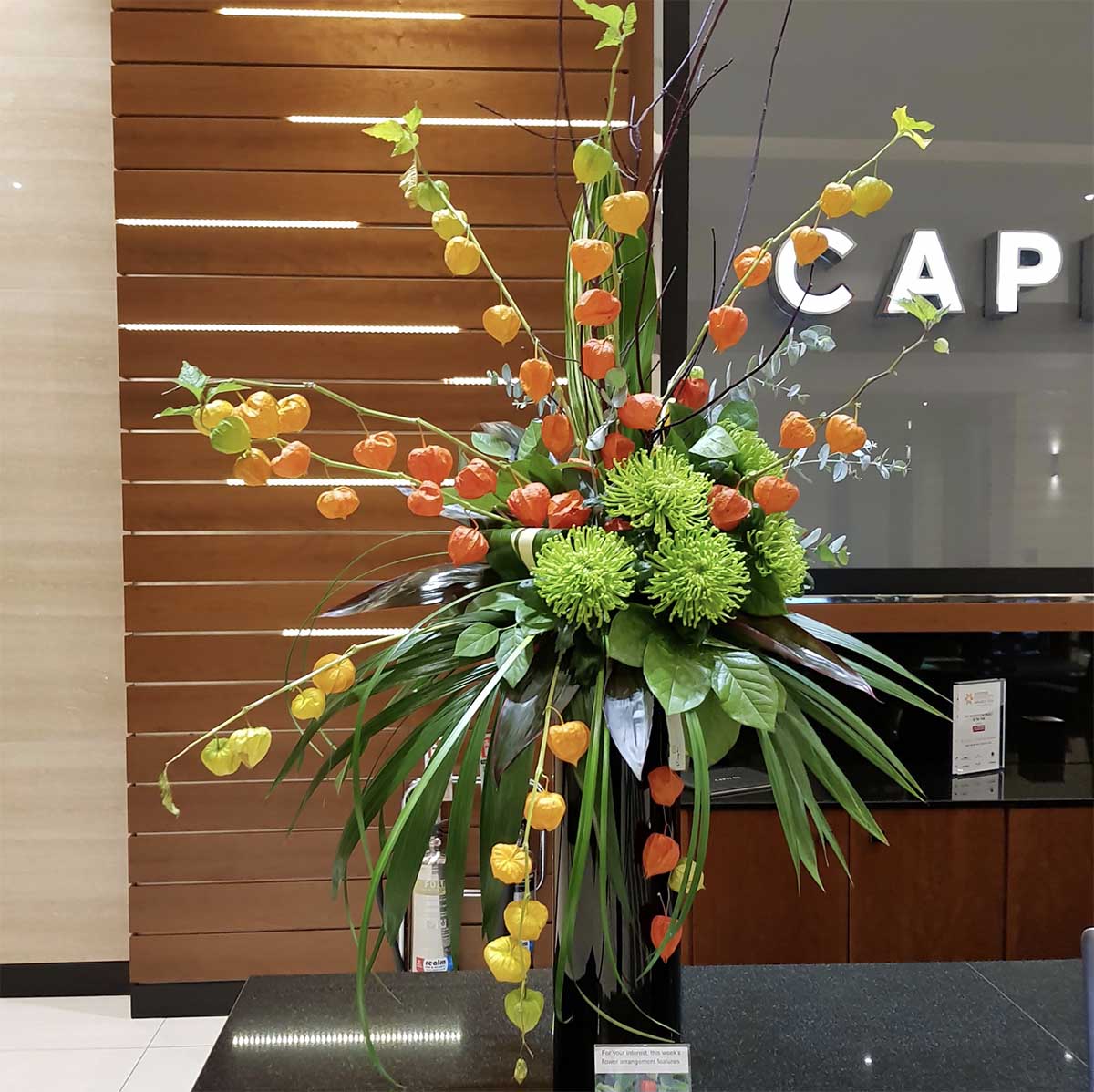 corporate flower display in black vase with bold flowers e.g. green anthuriums, chrysanthemums and dried red bunny tails and ruscus
