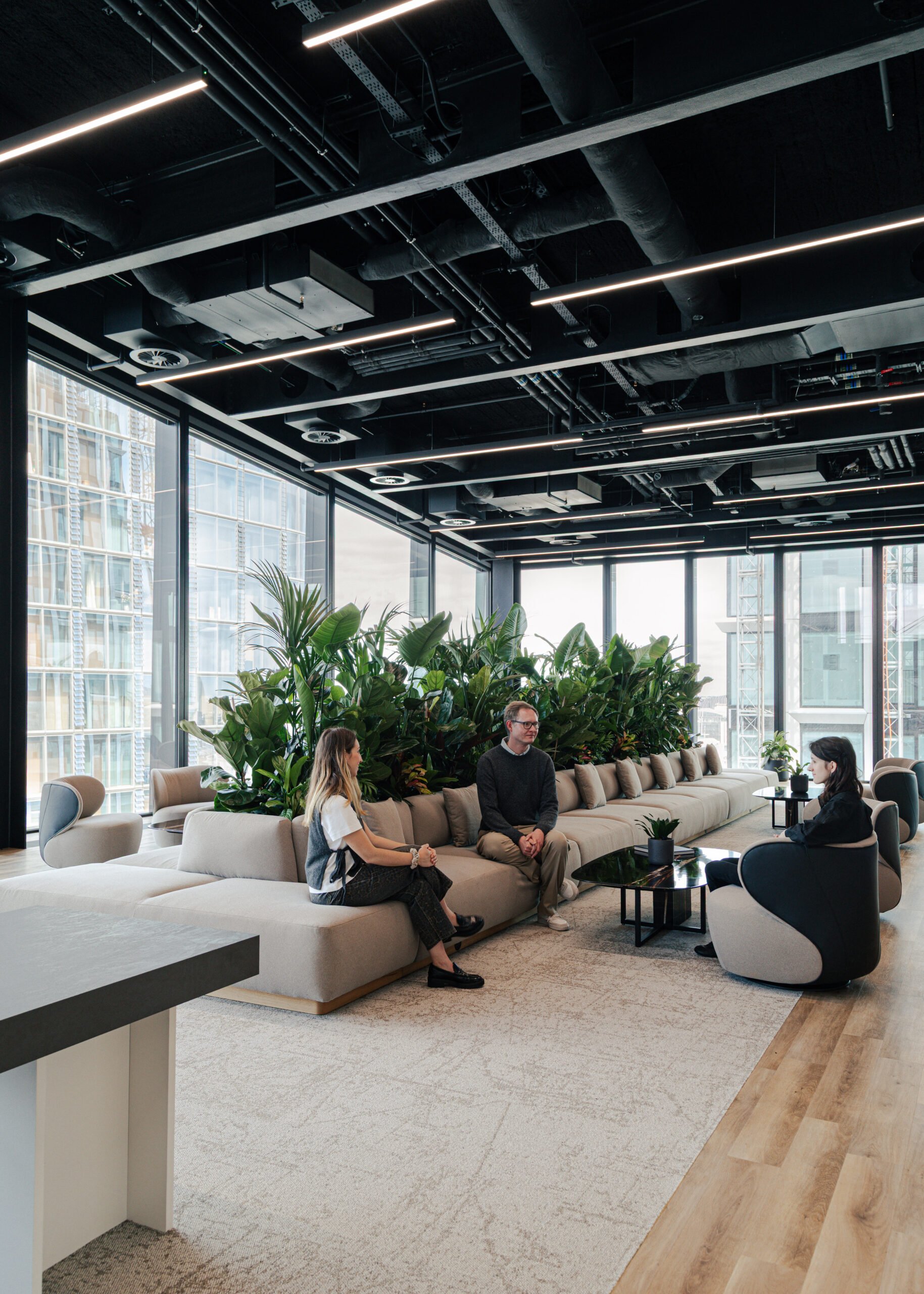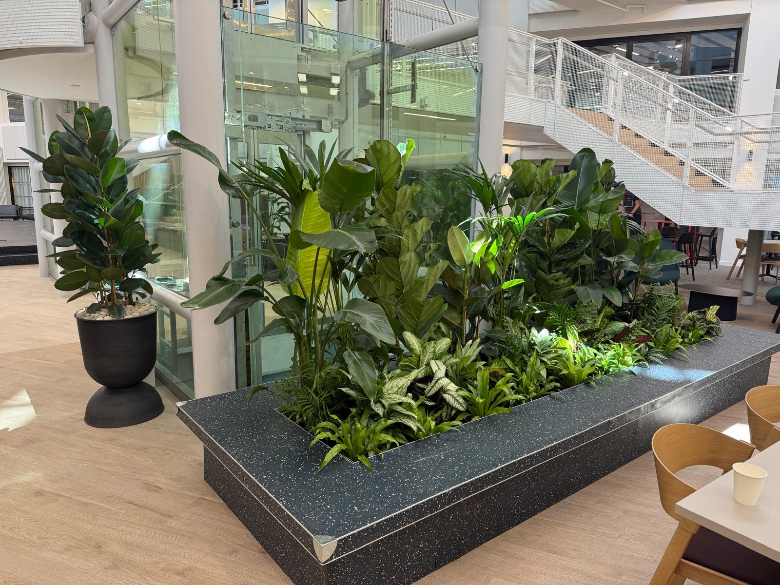 mixed live plant display behind the seating in an open space office area