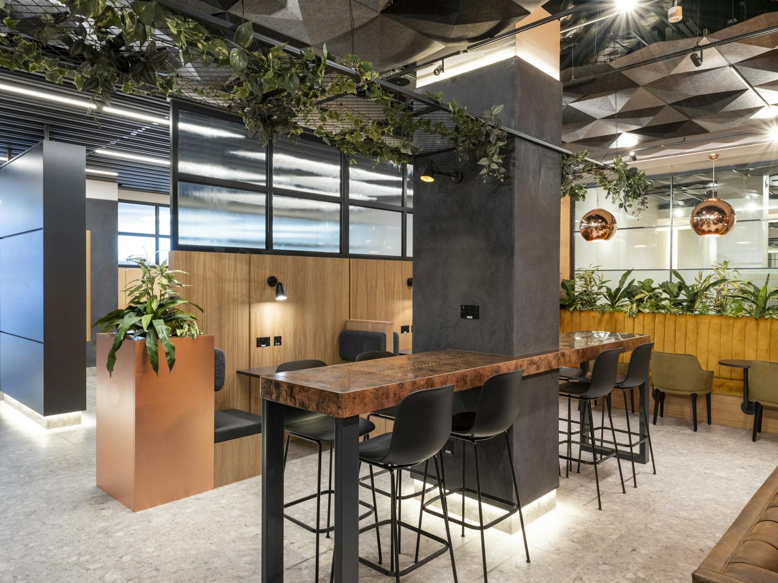 Lush Trough Planters and foliage trails on the ceiling brighten the room