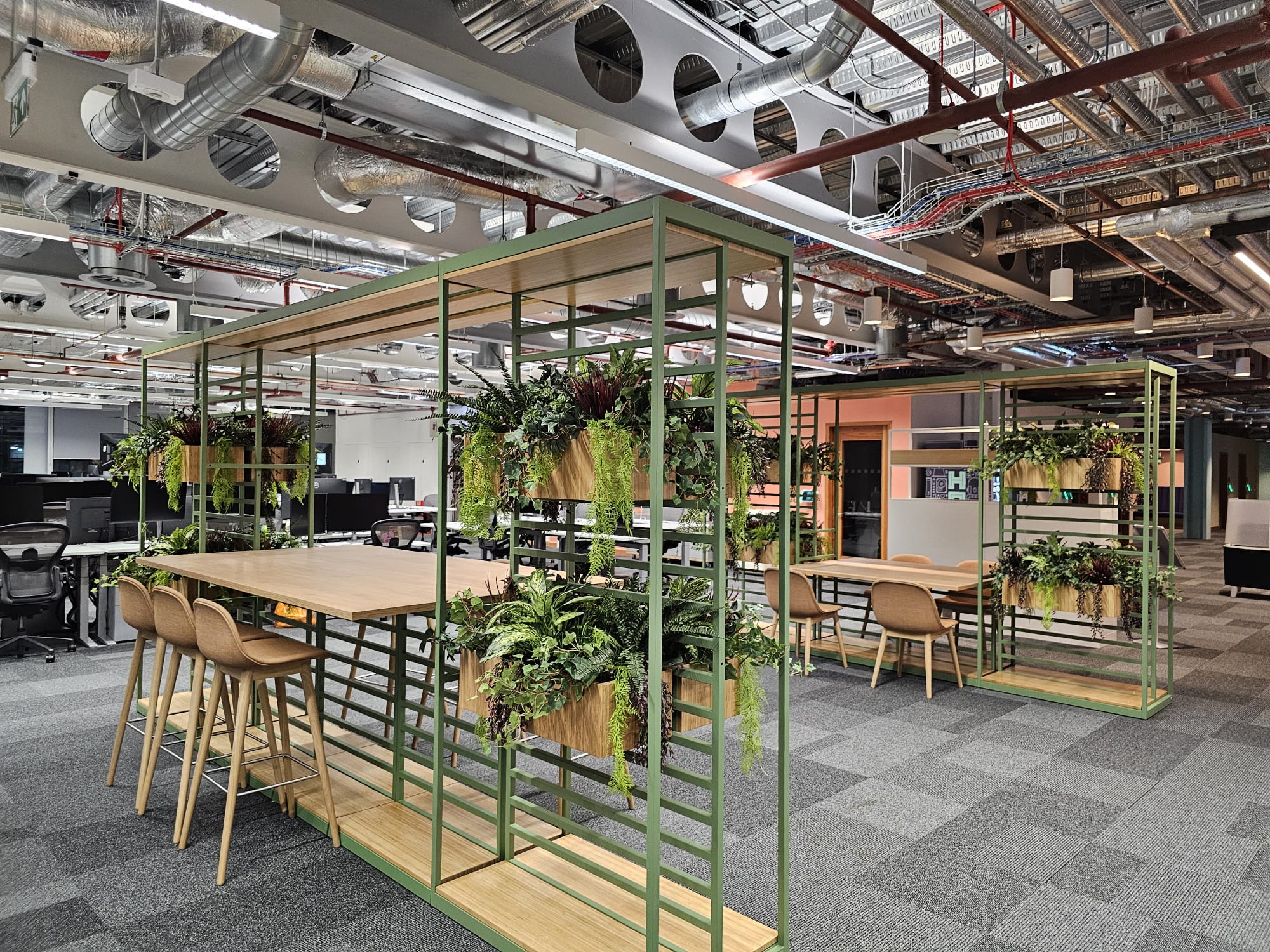 Living wall panels filled with plant life on castors to divide and separate open plan space in a modern office space