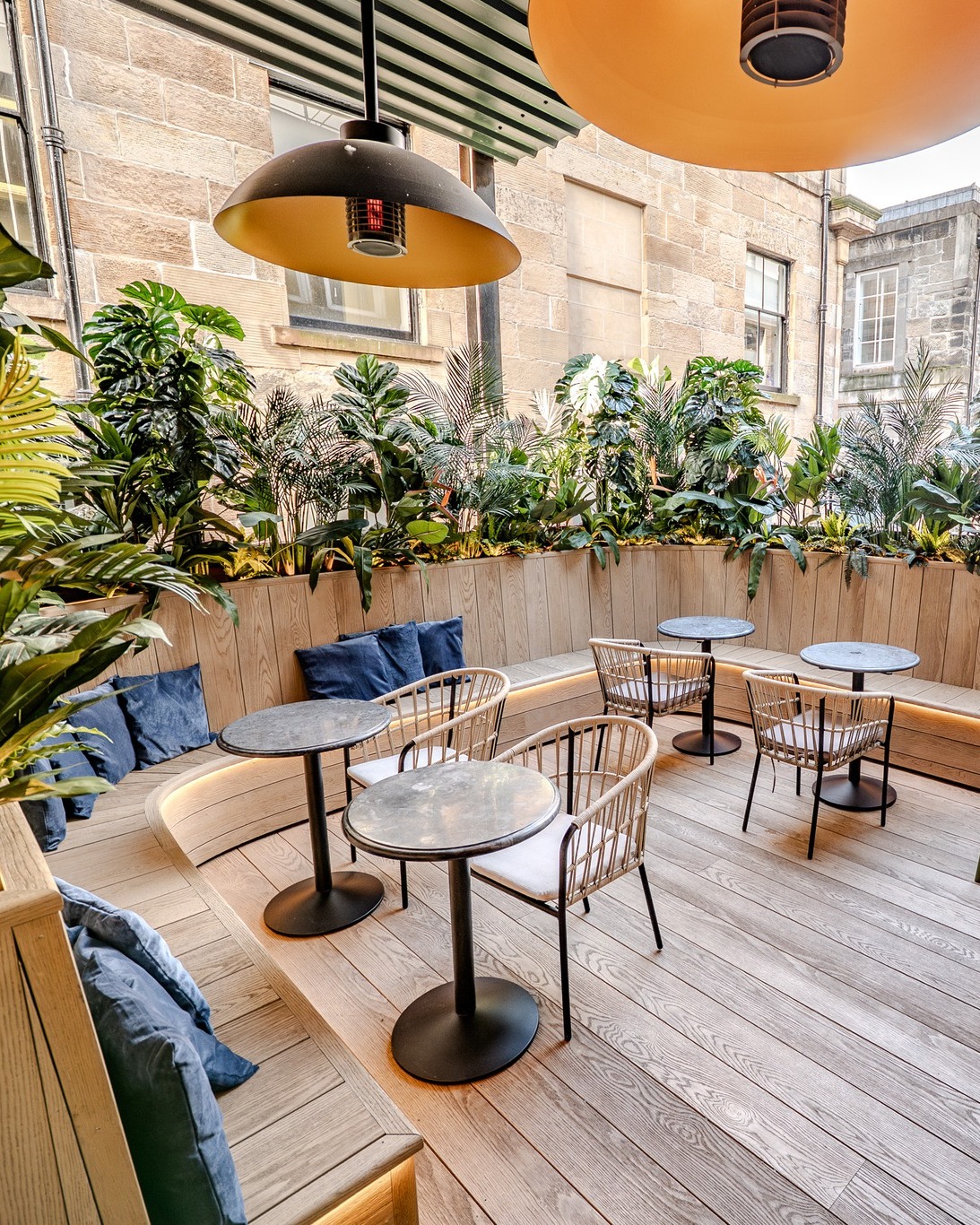 The Social Glasgow’s outdoor dining area with branded, sponsored blue parasols and buxus filled planters
