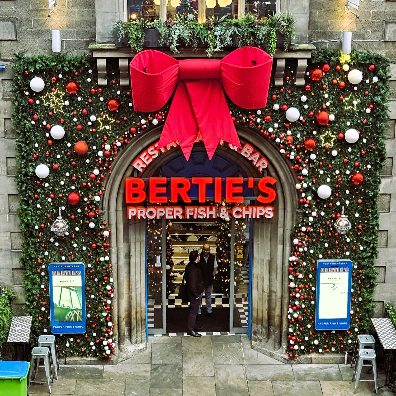 A Bespoke Christmas display of copper and white decorations framing the windows of this restaurant
