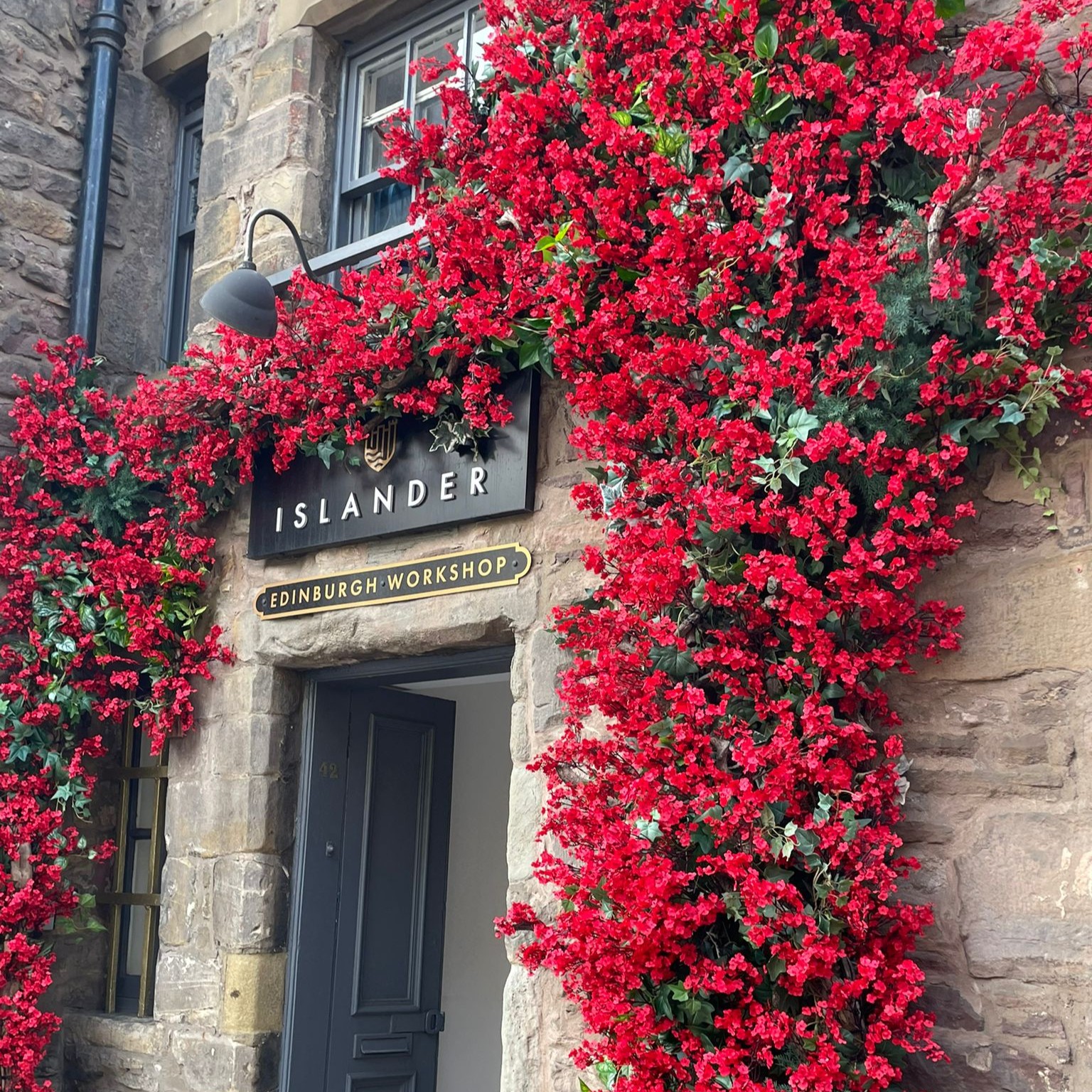 an exterior floral display with red and gold roses at the entrance of a coffee shop in glasgow