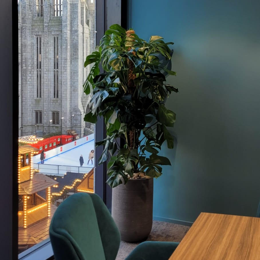 A live monstera on a moss pole sits in a boardroom at Peterson's in Aberdeen
