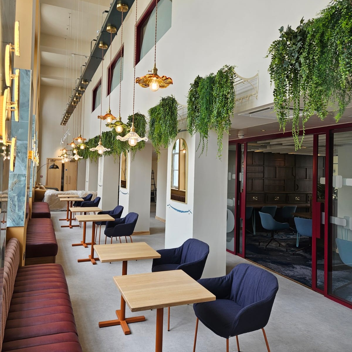 Live mixed planting interspaced with the plush sofas create a lovely touch to this plant-filled room in the Virgin Hotel, Edinburgh