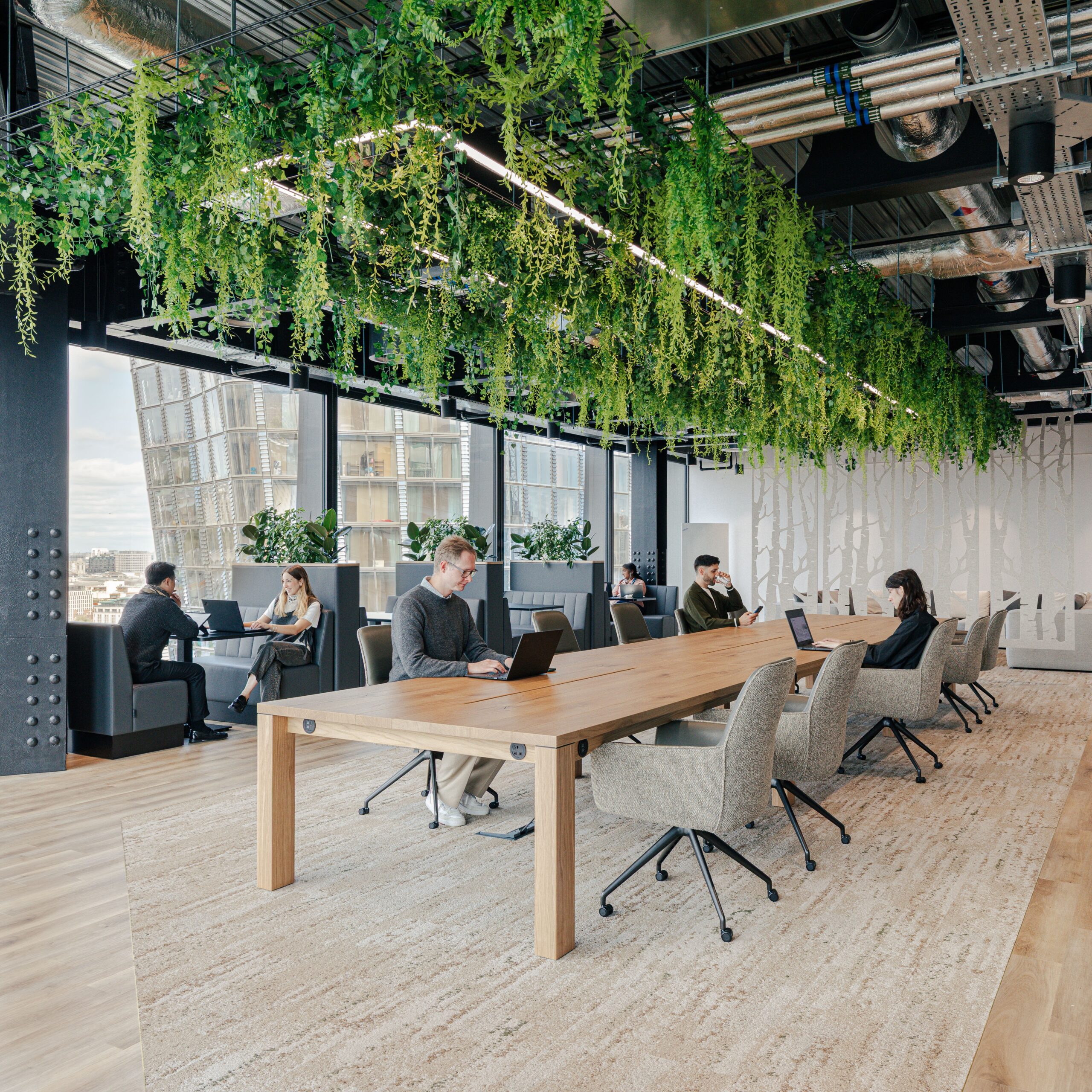 A frovi relic cloud desk in a corporate collaborative area with mixed artificial plants trailing down for a high impact natural look