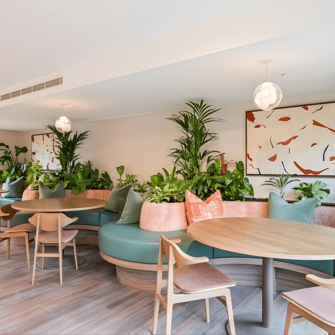 Artificial trailing strip planting lines the ceiling of the fowrie gardens cafe whilst live kentia palms decorate the space