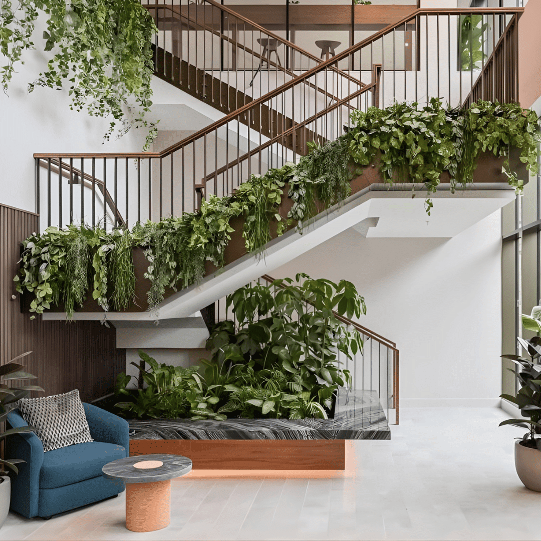 simple artificial green wall creates a soft natural impact on this staircase wall.