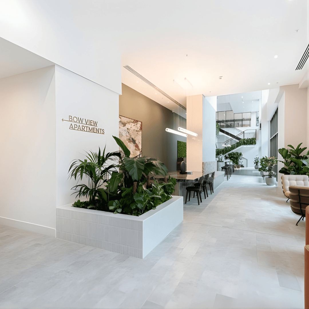 A white paravert planting system sits in a corporate waiting area as a feature planter with mixed live specimen plants