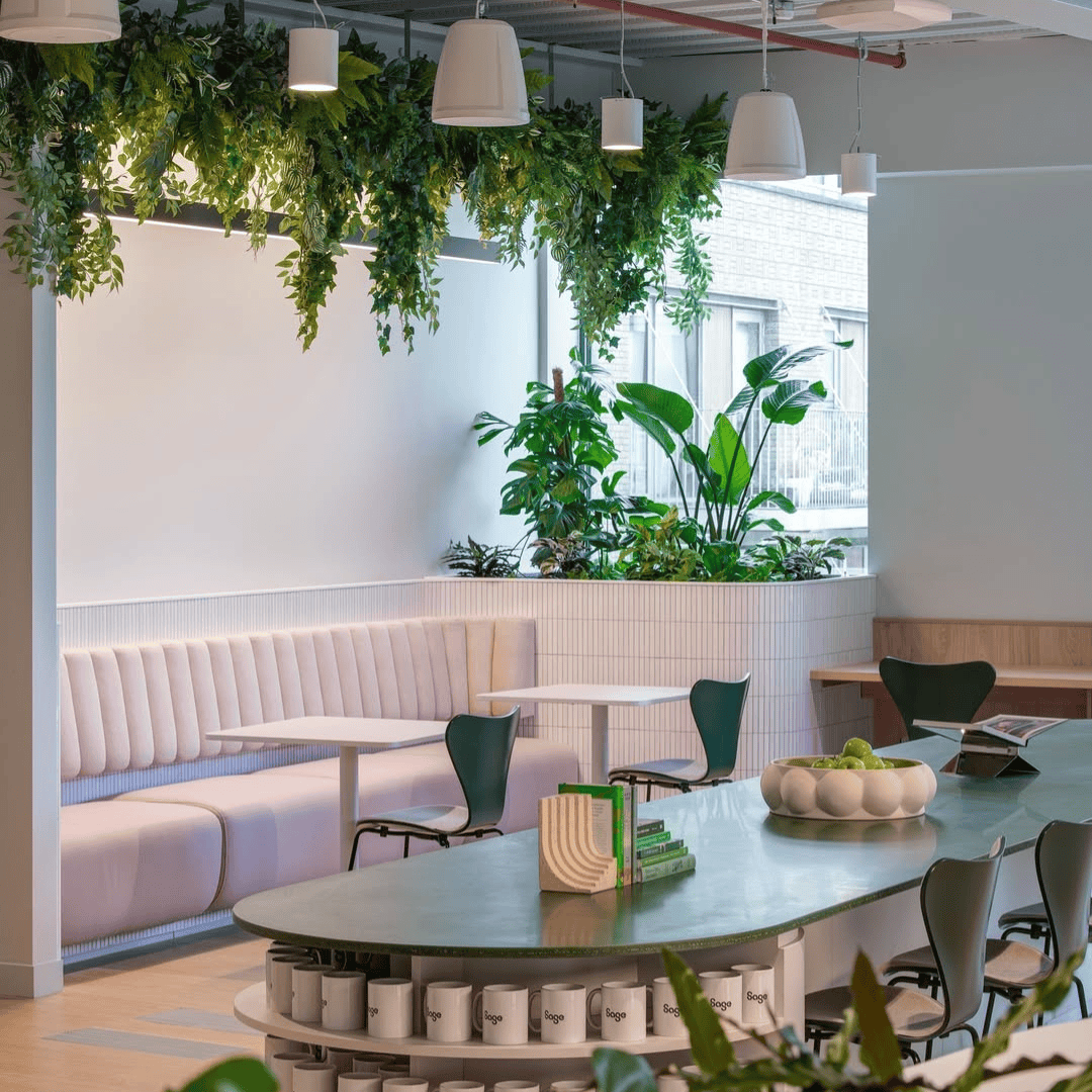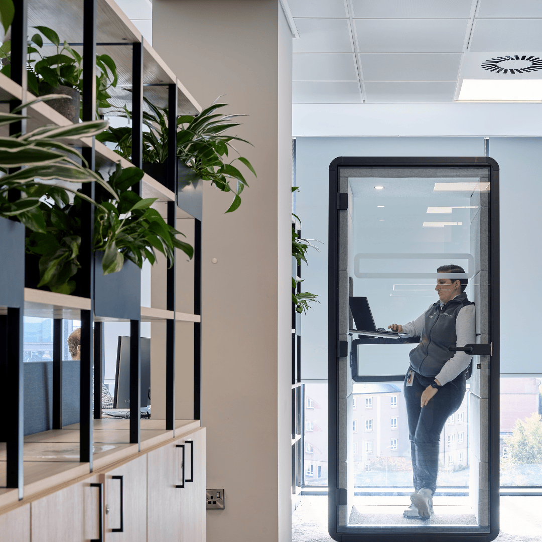 A bushy kentia palm in a bespoke ral-coloured planter stands within in the Edinburgh Coulters office