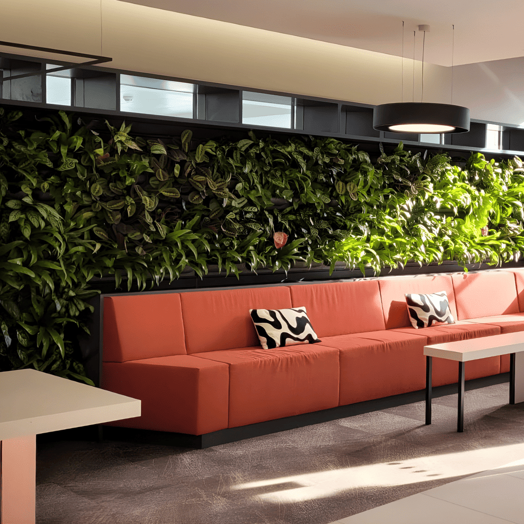 A variety of lush mixed live green specimen plants behind seating creates a great statement in a lobby or waiting area in a public space