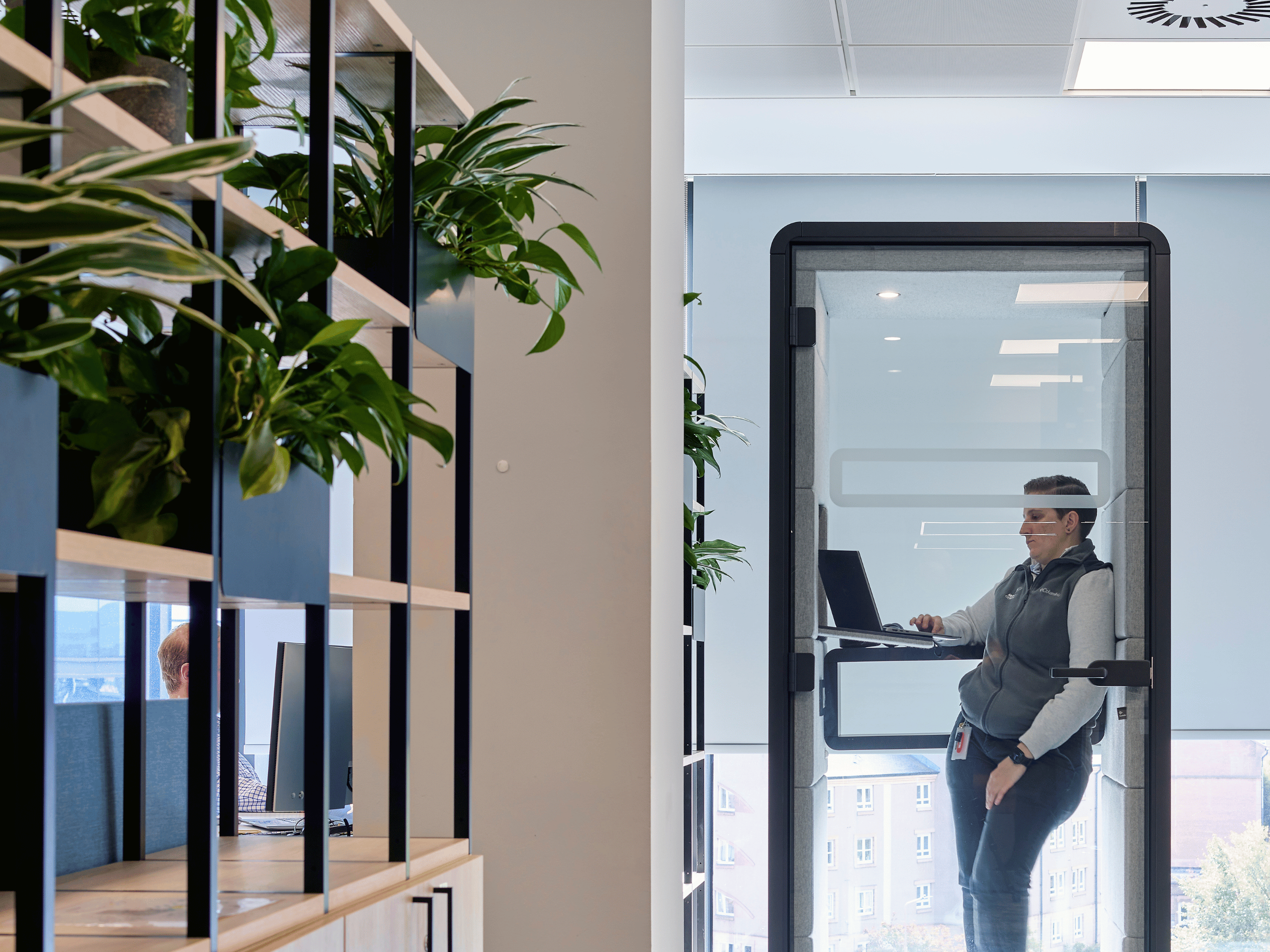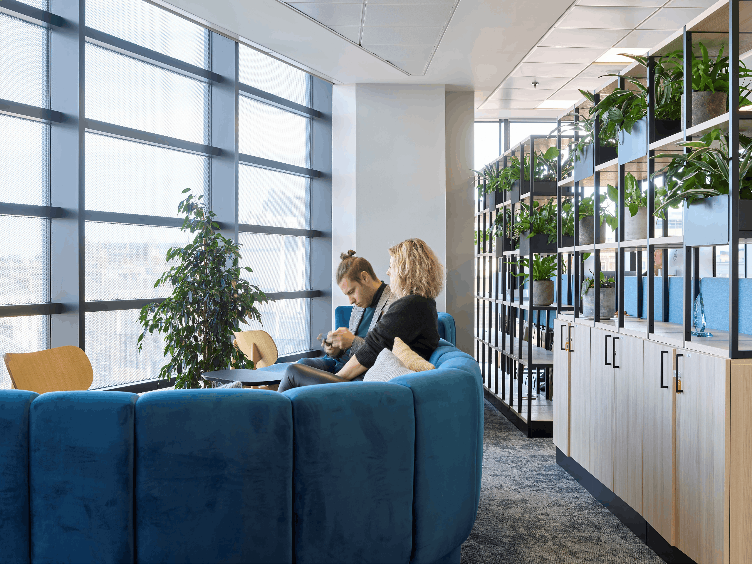 Across the main office floor, planting is carefully integrated into desks, storage and booth seating to improve air quality, reduce visual stress and improve wellbeing.
