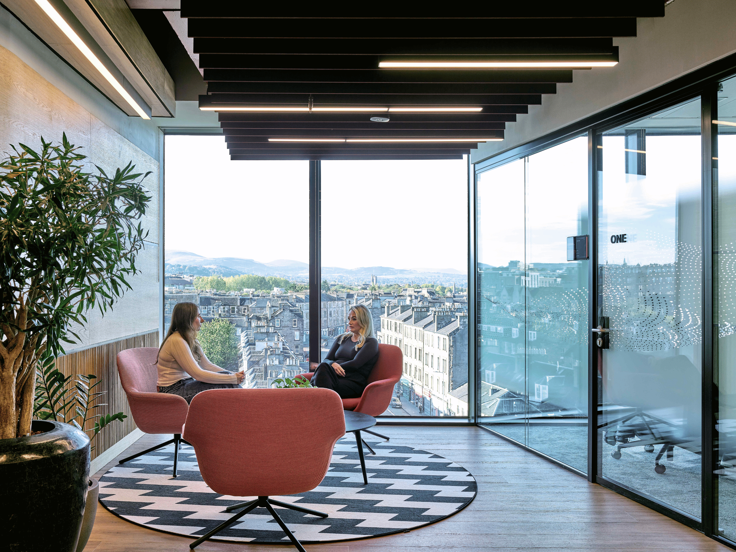 With views of Edinburgh’s landscape, the building provides a dramatic view of the city’s impressive landscape. Although the building is equipped with modern furniture, mid-century modern light shades and quirky cobalt-blue bubble sofas, it needed expert planting to make the overall look feel more intentional.