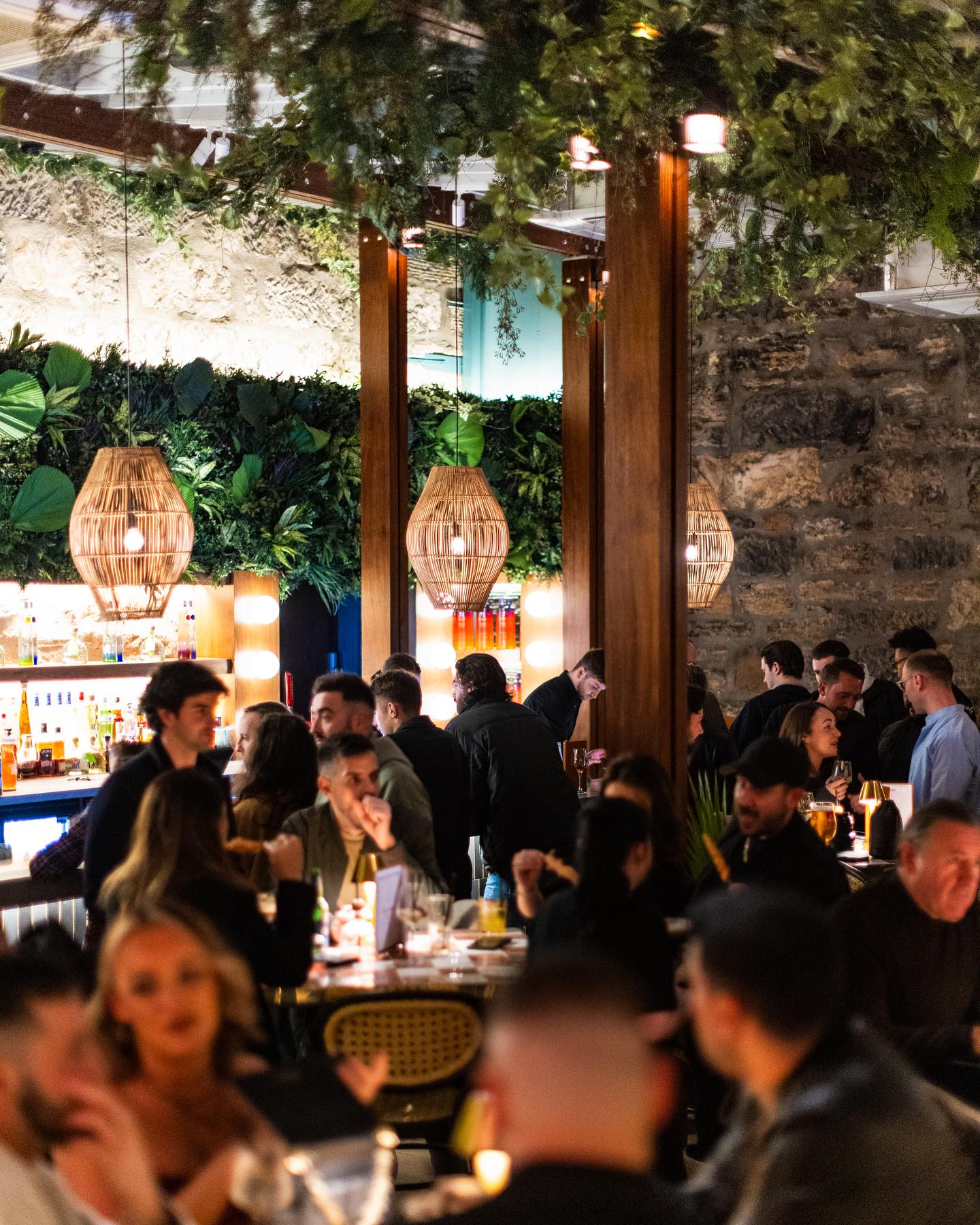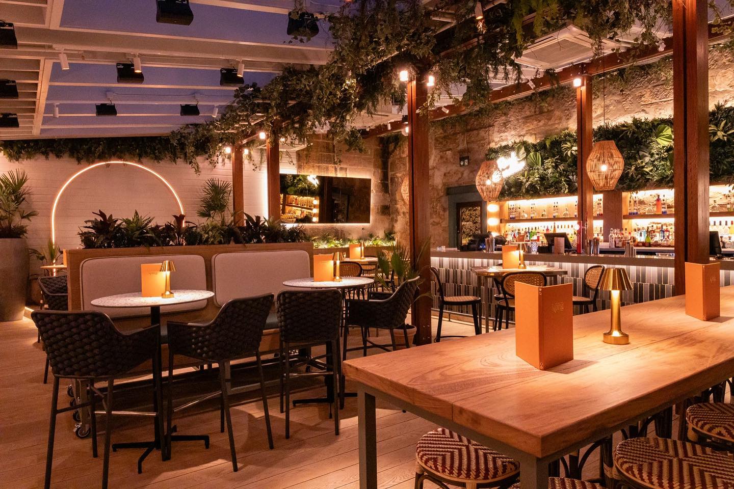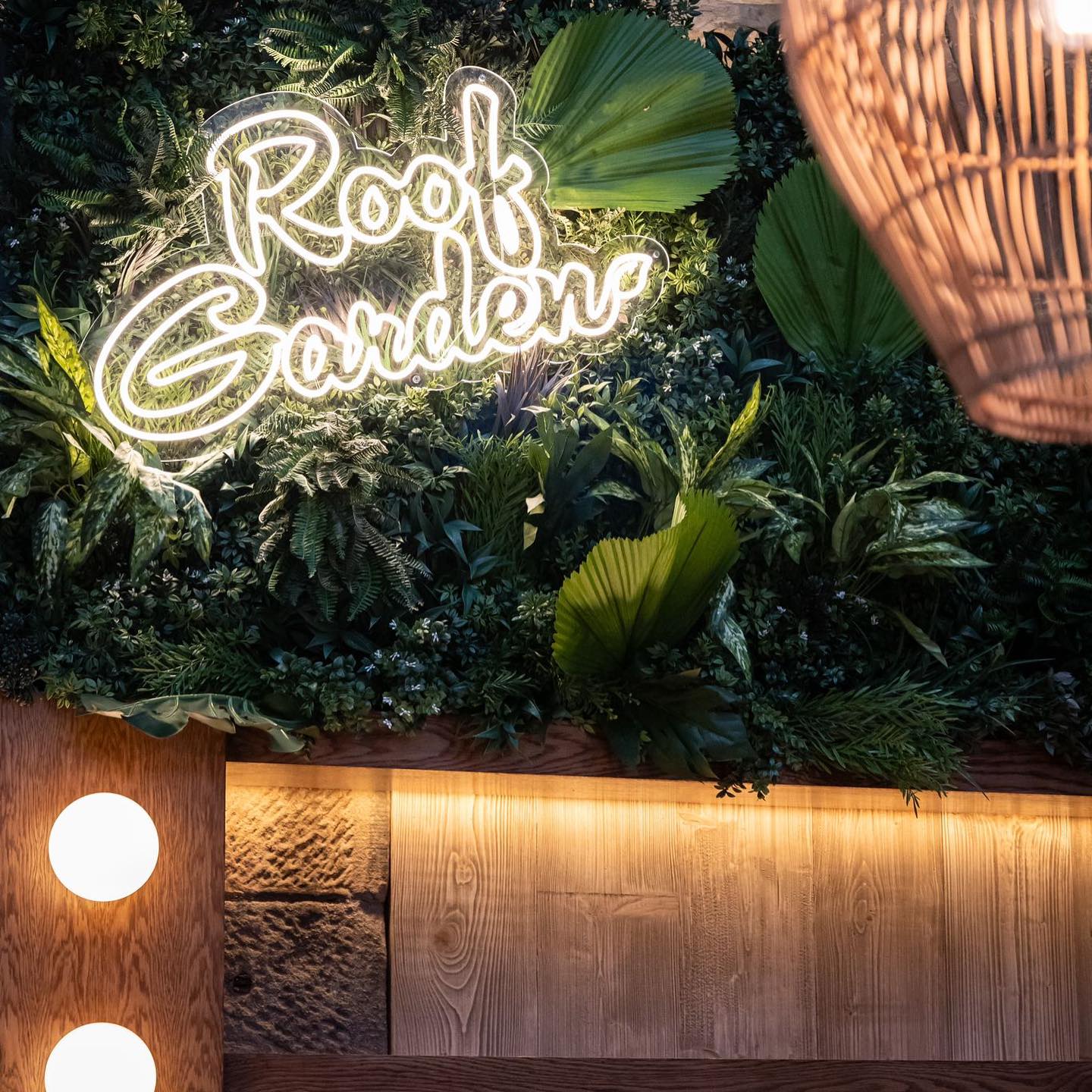 Above the bar itself, we installed a green wall with more tropical foliage, which was later finished with a custom ‘Roof Garden’ neon display.