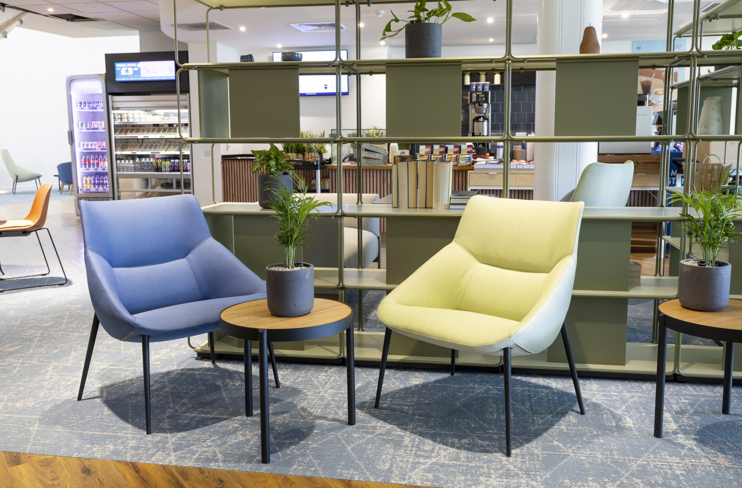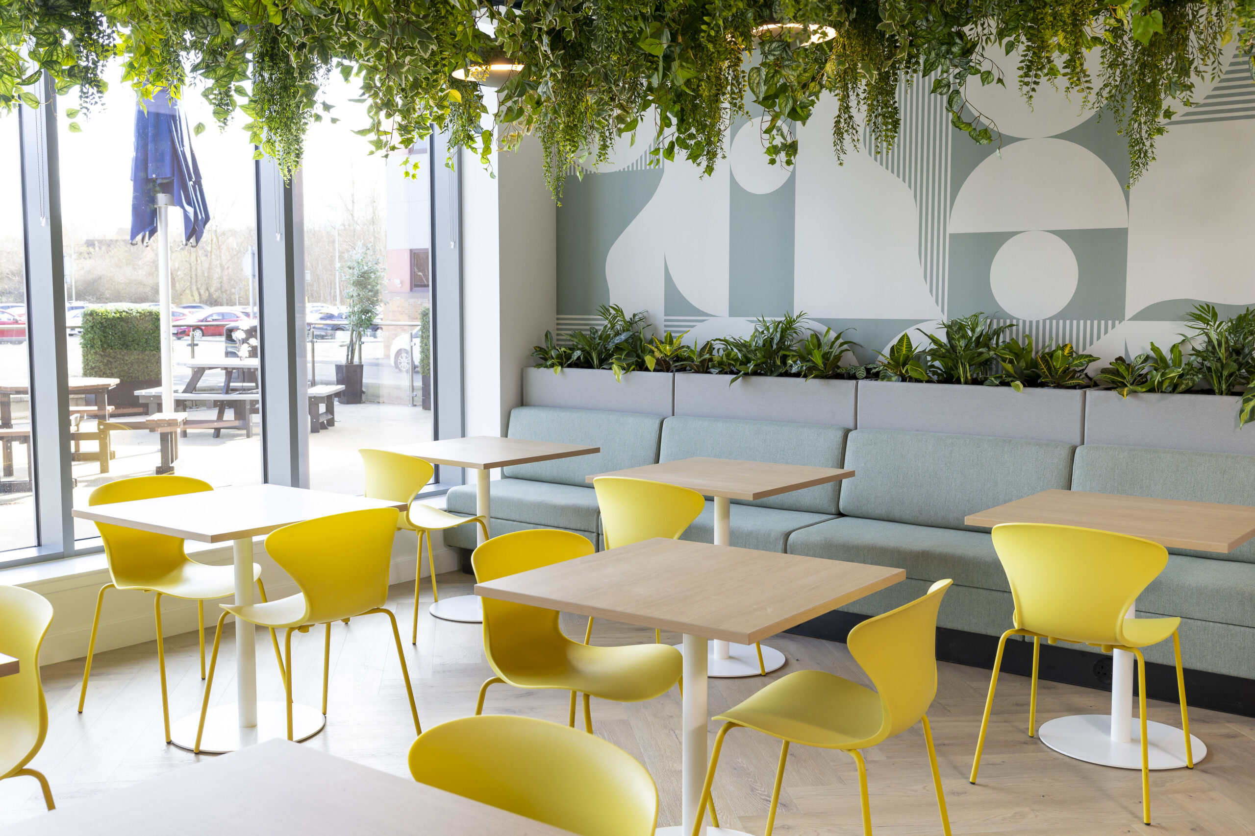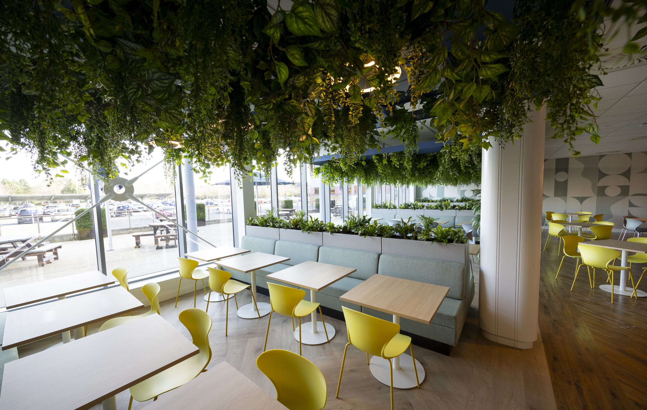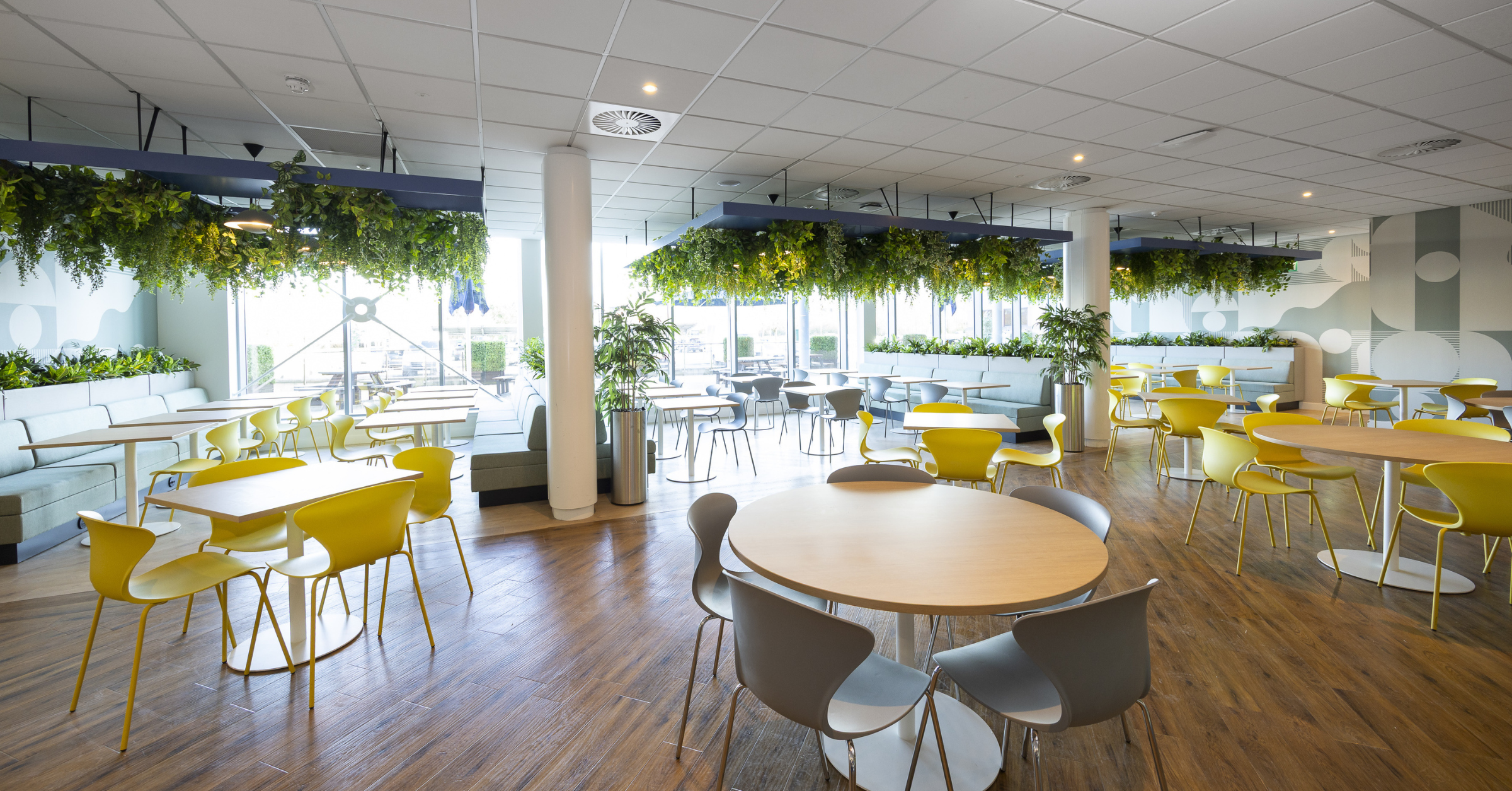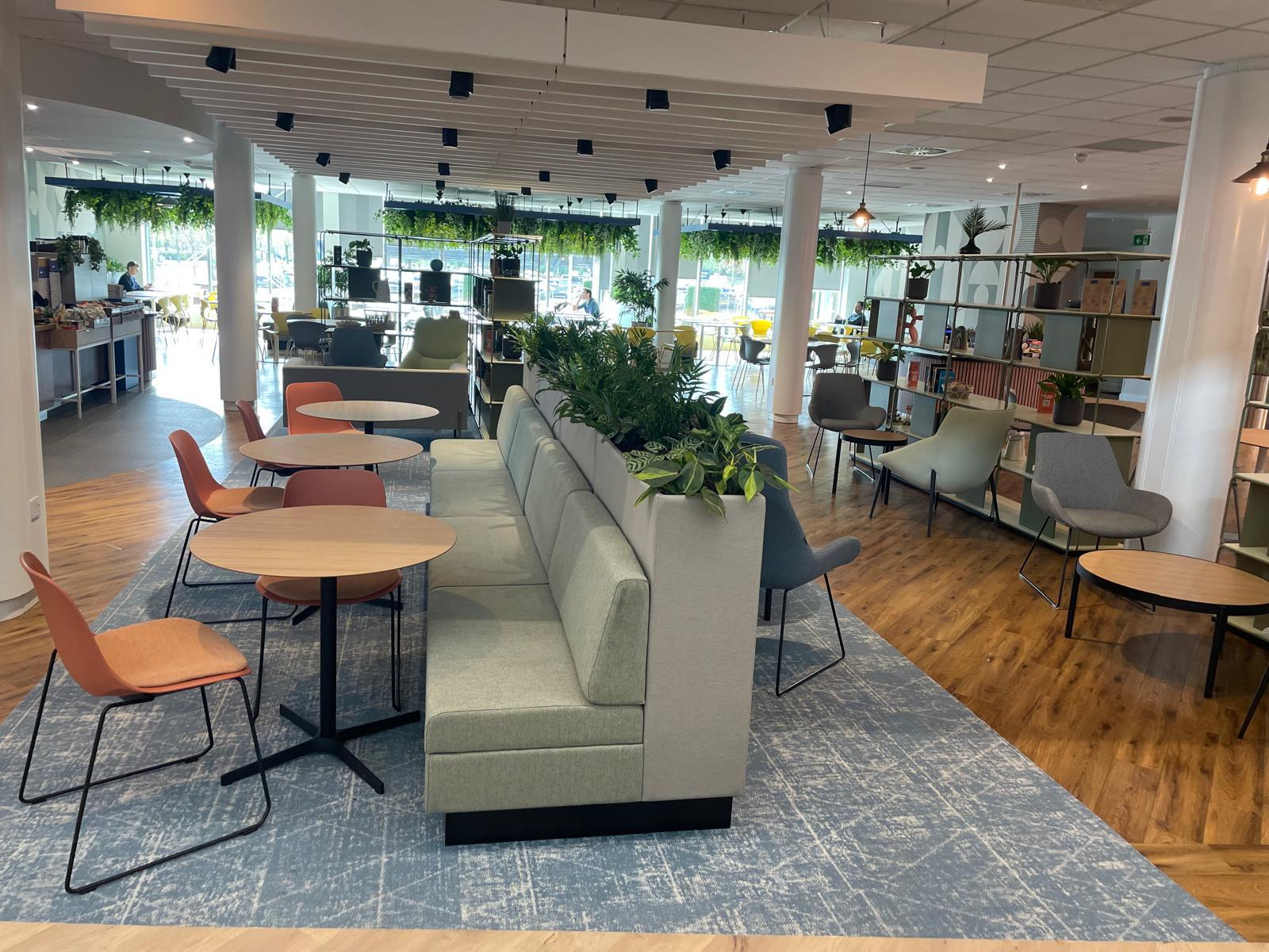 As part of the refurbishment of the Perth office canteen, SSE set out to update the space from a traditional, canteen-style layout into a modern, multifunctional café environment. The refreshed design brings together banquette seating with integrated planters, relaxed soft seating, informal collaboration areas, and a mix of floor-standing and suspended greenery, creating a space that supports both downtime and informal working throughout the day.