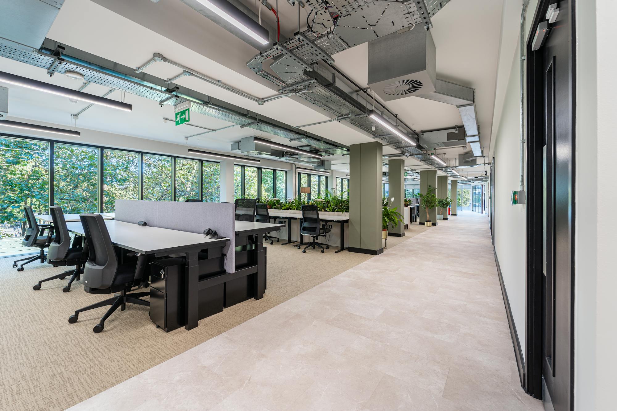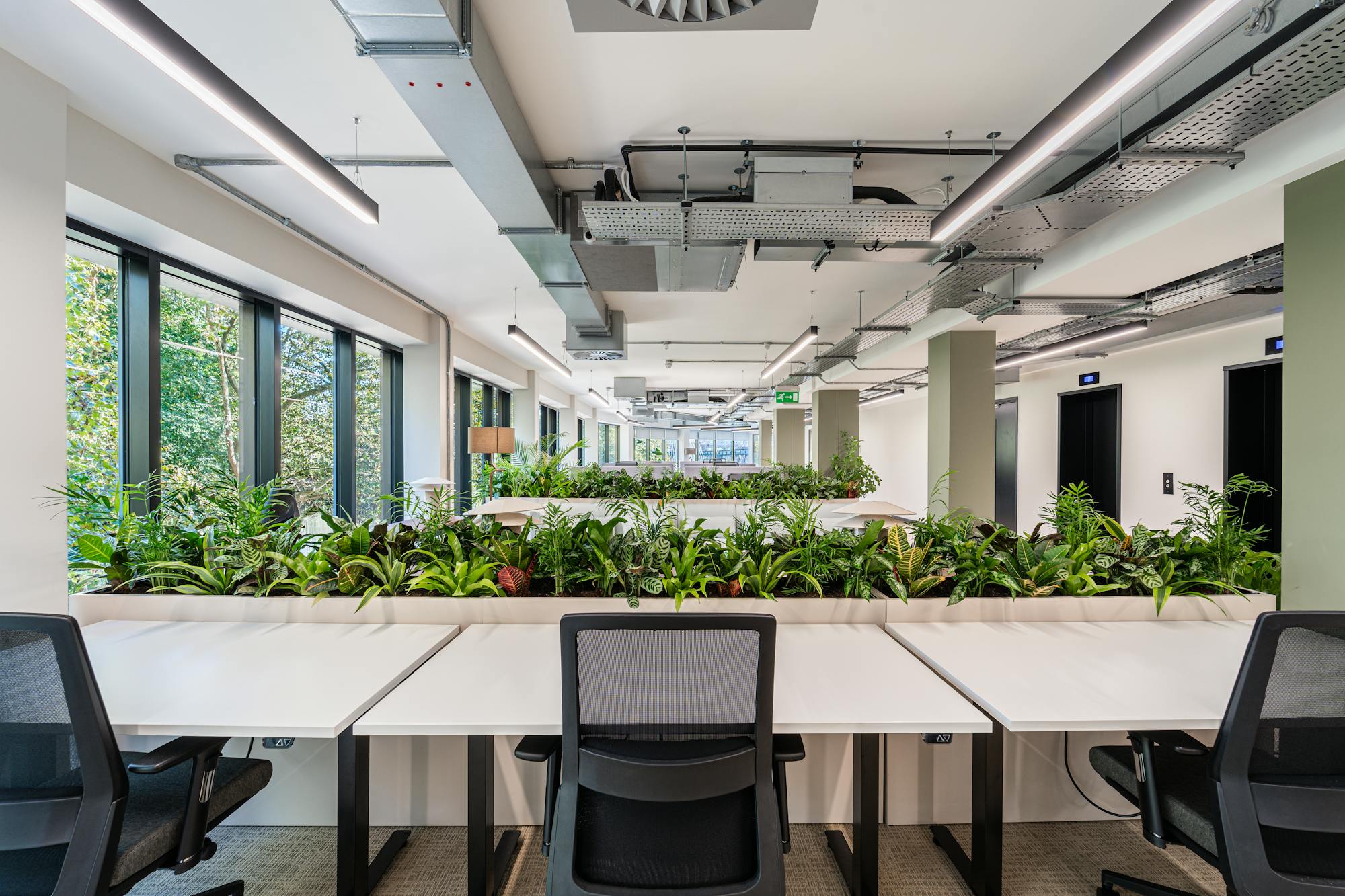 The planting scheme featured a mixed selection of foliage plants, including species such as Asplenium, Maranta and Aglaonema, chosen for their texture, durability and suitability for desk-adjacent environments.